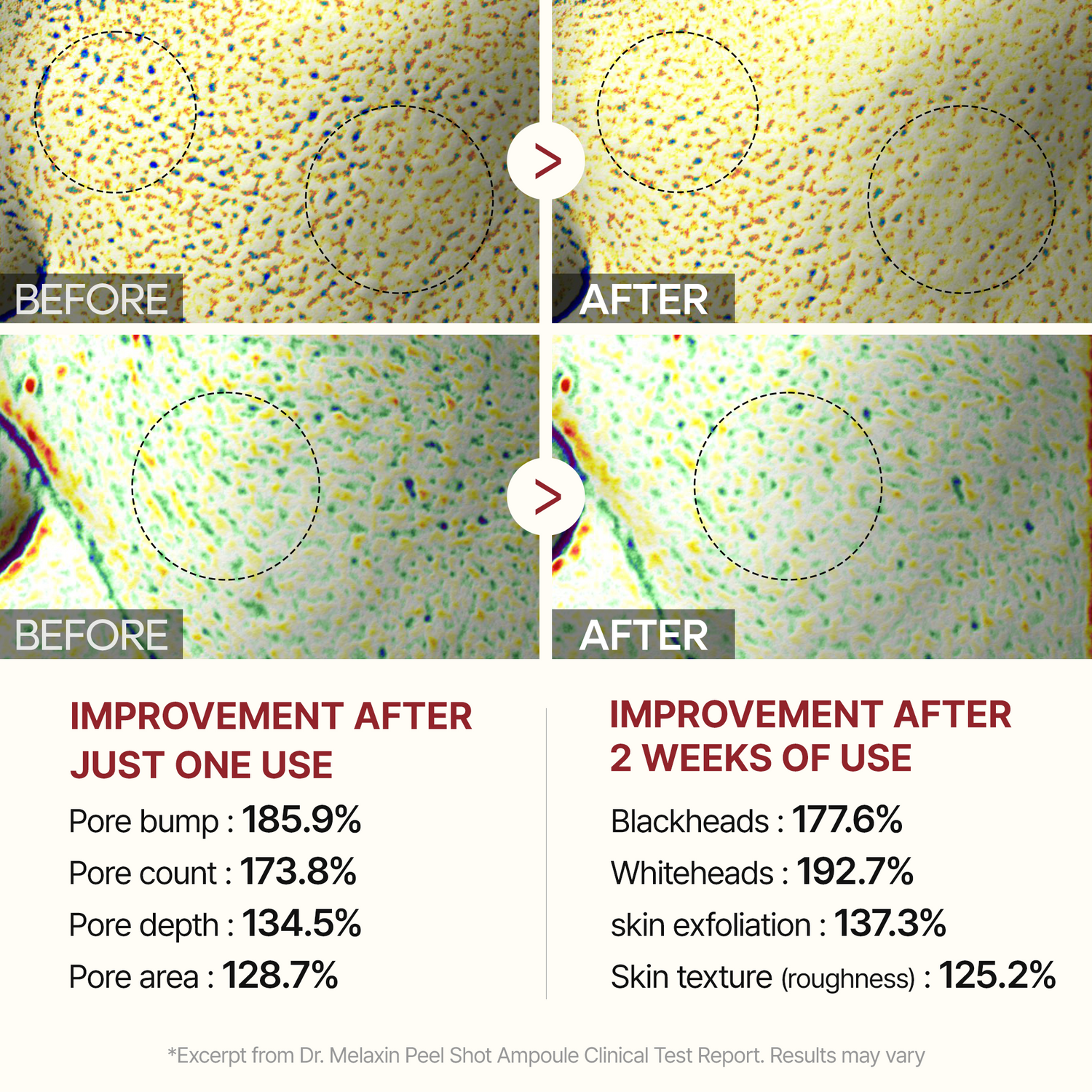 Visible After One Use · Noticeable in 2 WeeksClinically Measured Pore Refinement & Skin Renewal